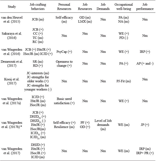 Table 3 presents the effect of the interventions on the outcomes of interest, organized according the JD-R theory broad categories: job crafting behaviors, personal resources, job resources, job demands, motivation, strain, and job performance (Bakker & Demerouti, 2017). The variables in the motivation and strain categories were merged into one group and labeled as occupational well-being (Table 3). Results reveal that studies measured the effects of job crafting interventions in a variety of outcomes under these broad categories.