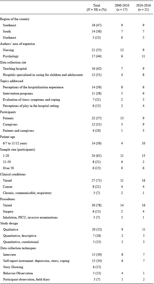 Annual publication rates increased over time, as evidenced by the high correlation between the year of publication and number of articles published (rho = .74). Seventeen articles were published between 2000 and 2010, while 21 were published between 2011 and 2016. Nursing (n = 21) and Psychology (n = 17) were the most heavily represented areas among the articles reviewed. Eighteen studies were conducted in Southern Brazil, 14 in the Southeast, while five studies were conducted in the Northeast region of the country. The majority of data collection took place in university hospitals and institutions specializing in child and adolescent health care (Table 1).