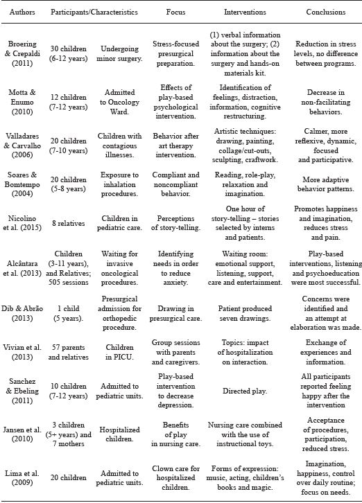 The literature also proposed interventions, many with evidence of positive results. However, the lack of detailed descriptions and evaluations precluded a more thorough discussion of these findings in the present review. The use of play techniques, however, was cited, analyzed and emphasized by several studies, cementing its status as an important contributor to the quality of life of patients and their families in the hospital setting.