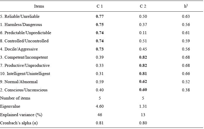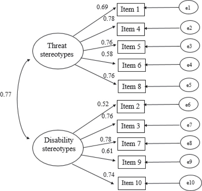 Component 1, named Threat Stereotypes, comprised 5 items (Example of item: Harmless/Dangerous), had an eigenvalue of 4.599, explained 46% of the total variance, and had an internal consistency of α = 0.81. Component 2, named Disability Stereotypes, consisted of 5 items (Example of item: Productive/Unproductive), had an eigenvalue of 1.311, explained 13% of the total variance, and had an internal consistency of α = 0.80. These results seem to provide evidence in favor of the factor validity and internal consistency of the SSMI. To determine to what extent the two-component model is adequate, a new study was conducted. The second study was performed with the objective of testing - on a different sample - the replicability of the proposed two-factor structure, using confirmatory factor analysis (CFA).