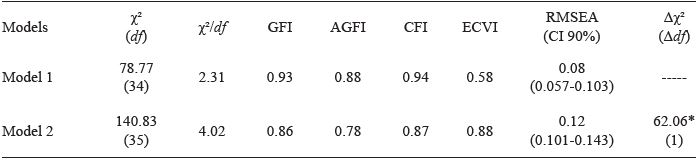 In addition to SPSS (version 21.0), which was used to calculate descriptive statistics, the AMOS statistical package (version 18) was used. The latter was used to perform confirmatory factor analyses, taking into account the cova-riance matrix and adopting the Maximum Likelihood (ML) estimator. The missing cases were replaced by the mean. To evaluate the fit of the proposed model and to compare it with alternative models, the following indices were considered: χ2 (chi-square) - the higher this value, the worse the fit; χ2/df (i.e., the ratio of the chi-square value to the degrees of freedom) - on this index, values below 5 indicate an adequate fit of the model; the Goodness-of-Fit Index (GFI), Adjusted Goodness-of-Fit Index (AGFI), and the Comparative Fit Index (CFI), whose values range from 0 to 1, with those close to 0.90 indicating a satisfactory fit; and Root-Mean-Square Error of Approximation (RMSEA) - with its 90% confidence interval (90% CI), where values between 0.05 and 0.08 are considered ideal, but values up to 0.10 are acceptable (Byrne, 2010; Garson, 2012). In addition to these indicators, the chi-square difference (Δ;χ2) and the expected cross-validation index (ECVI) were used to compare the models. The Δ;χ2 is a statistical test with a significance level, accepting p < .05 and penalizing models with a higher χ2 value. In the ECVI, lower values reflect a model with a better fit (Garson, 2012).