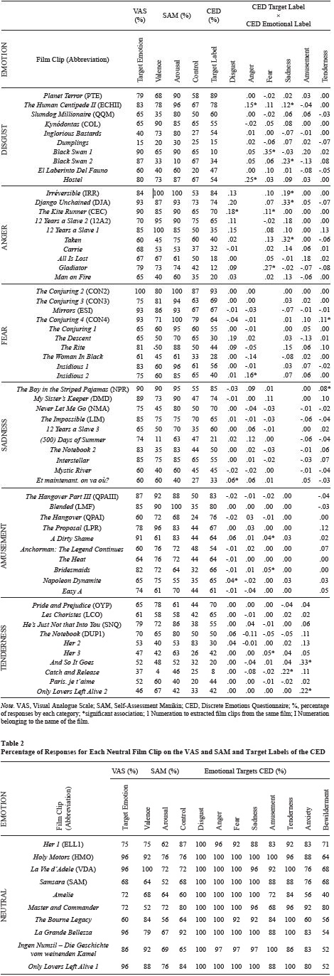 Some clips, such as those that corresponded to Dumplings (disgust), (500)Days of Summer (sadness), and Catch and Release (tenderness), did not present the expected scores in most of the indices that were considered. Additionally, other clips, such as Black Swan 1 (disgust), WhenAll Is Lost (anger), and Gladiator (anger), although they presented expected scores for the emotion and on the subscales of the SAM, the percentage of expected scores for the target emotion of the CED did not reach 20%. Therefore, of the 70 film clips, only those with optimal scores were selected. Considering the scores on the VAS, SAM, and CED, four film clips (underlined in Table 1 and Table 2) were selected for each emotional category with appropriate values according to the defined criteria (28 total).