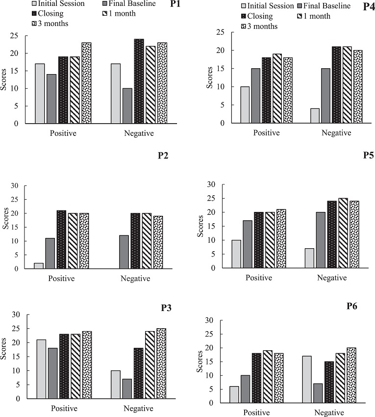 Figure 1 shows the distribution of SSPS scores obtained by participants in the initial session, at the last baseline session, in the closing session, and at the 1- and 3-month follow-up sessions; the higher the scores were on the positive and negative SSPS subscales, the better the self-assessment when speaking in public. Figure 1 compares the initial session with the final baseline session, indicating that the Group 1 participants (P1 and P3) presented a reduction in positive and negative subscale scores; however, P2's increased scores on both scales. Both positive and negative subscale scores increased for the three Group 2 participants (P4, P5 and P6), except for P6's on the negative subscale. Comparison of the last baseline session scores and the last intervention session scores revealed that all of the participants' scores increased on both the negative and positive subscales. The participants maintained the previous values or showed a slight increase over the previous intervention session in the 1-month and 3-month follow-up sessions. Statistical analysis of the SSPS data was performed considering the six participants and the positive and negative subscale, which has shown that there was a statistically significant difference for Repeated Measures Analysis of Variance for both subscales (α = .0001). Post hoc tests determined which data contributed to this main effect. Tests of all pairwise comparisons for both subscale, using Tukey-Kramer Multiple Comparisons Test, revealed significant differences (α < .05) between: initial sessions compared to closing sessions; initial sessions compared 1-month follow-up and to 3-month follow-up; final baselines compared to closing sessions; final baselines compared 1-month follow-up and to 3-month follow-up. There were no statistically significant differences (α > .05) between: initial sessions compared to final baselines; closing sessions compared to 1-month and to 3-month; and 1-month follow-up compared to 3-month follow-up.