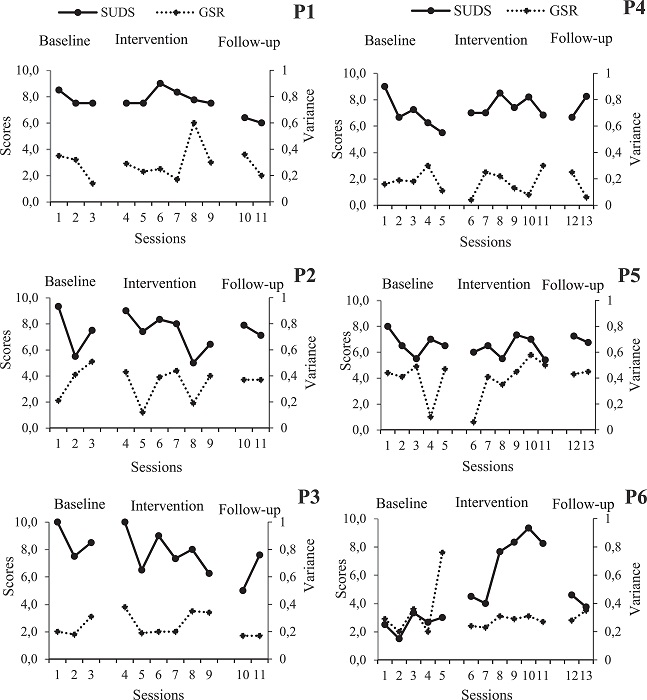 Figure 2 presents mean SUDS scores and GSR variance over the baseline sessions (1 to 3 - Group 1; 1 to 5 - Group 2), intervention sessions (4 to 9 - Group 1; 6 to 11 - Group 2) and follow-up sessions (10 to 11 - Group 1; 12 to 13 - Group 2). The anxiety scores reported (SUDS) by both groups during baseline sessions tended to be reduced, except for P6, who reported higher scores in the last three sessions than in the first two. During the intervention, the participants' SUDS scores varied: P1's scores tended to decrease, with an increase in Session 6, in which there was a change of scenery (more people in the audience and people who were not paying attention); P2, P3, P4 and P5's scores increased in all of the sessions in which there was a change of scenery; and P6's scores increased from Session 3 to Session 10, with a reduction in Session 11. SUDS scores were lower during follow-up sessions than during the first intervention session, except for P4 and P5. In the follow-up sessions, the participants' SUDS scores varied as compared to the previous sessions: P1 and P6's scores decreased; P3's scores decreased in the 1-month follow-up session but increased in the 3-month follow-up session; P4's was the same as in the last intervention session but increased in the 3-month follow-up session; P2's scores increased in the 1-month follow-up session but decreased again in the 3-month follow-up session; and P5's scores increased and returned to the levels recorded at the baseline interventions. GSR data also varied among participants: P1's GSR variance decreased in each baseline session; P2 and P3's increased, and the variance of the other participants varied. In the intervention sessions, participants presented greater GSR variance in sessions in which scenario changed - Session 4 (P2 and P3), Session 6 (P2), Session 8 (P4 and P6), Session 8 (P1) and Session 10 (P6). The participants' GSR variance decreased in the 1- and 3-month follow-up sessions compared with the last intervention session, except for P1 (Session 10) and P6 (Sessions 12 and 13). Statistical analysis of correlation (Spearman Rank Correlation) between SUDS and GSR data of each participant was not significant (p > .05).