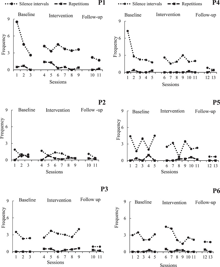 Figure 3 presents the frequencies of the operant behaviors recorded while the participants were speaking. The maximum speech repetition frequency presented was two per session, with a reduction as the intervention sessions progressed. Statistical analysis (Friedman Test) of the differences between speech repetition frequency in three conditions was significant (p = .0055). Tests of all pairwise comparisons, using Dunn's Multiple Comparisons Test, show significant difference (α < .05) between baseline sessions and follow-up sessions. There were no significant differences between baseline sessions and intervention, and intervention and follow-up (α > .05). Silence intervals were more frequent in the first baseline session and tended to decrease during these sessions in the cases of P1, P2, P3 and P4 (Figure 3). There was a small variation in the frequency of participants' pauses during the intervention sessions, and there was no variation related to scenario changes. With the exception of P2, participants showed a reduction in pause frequency in the follow-up sessions compared with the last intervention session. There was no significant differences in pause frequency (Friedman Test) when comparing the three conditions (α = .9563). The frequency of silence intervals was well below the frequency of speech repetition, with no particular trend; however, in sessions in which there was a change in scenery, the frequency of such behavior increased in some cases, such as in Session 6 (P1), Session 9 (P3) and Session 6 and 7 (P6).