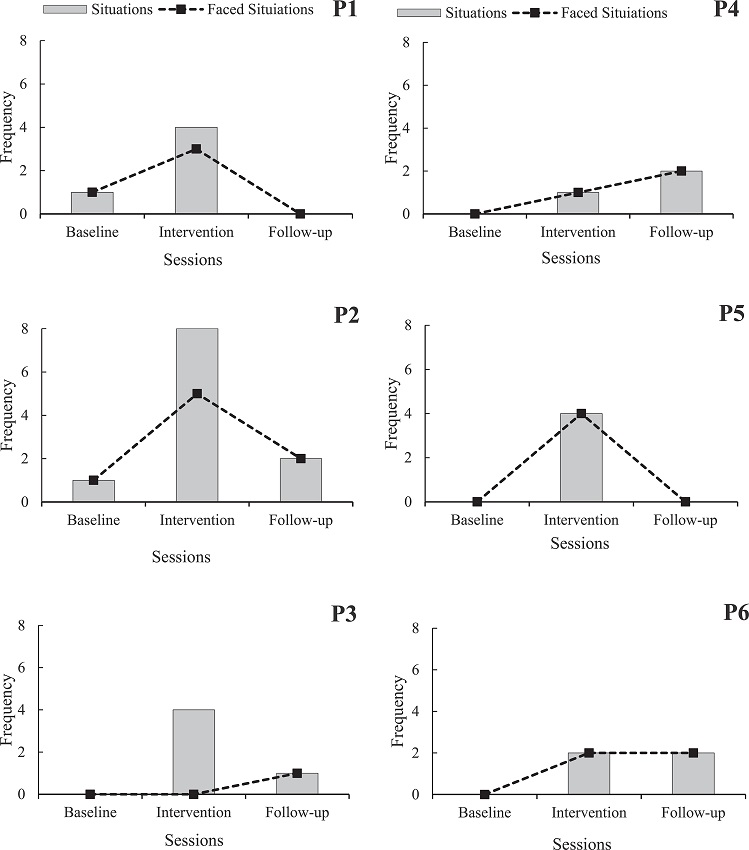 With regard to the public speaking opportunities noted on the recording sheets provided in the last baseline session, only P1 and P2 reported coming across a speaking situation (see Figure 4). During the intervention phase, P4, P5 and P6 faced all situations, including the follow-up phase, except P5, who did not have the opportunity to do so at the follow-up phase. P1 and P2 faced most situations at the intervention phase, whilst P3 faced none of them in the intervention phase, but did do so at the 3-month follow-up phase.
