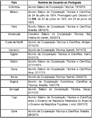 Apartir de los años 1970 Brasil pasó a realizar acciones de cooperación técnica con países latinoamericanos y africanos. Sus programas se focalizaron en la formación de funcionarios gubernamentales de alto nivel y becas de estudios principalmente dirigidas a países de África. De los acuerdos firmados durante ese periodo (ver Cuadro No. 1) se destacan entre 1972 y 1975 los celebrados con Colombia, México, Perú, Venezuela, Costa de Marfil, Camerún, Egipto, Gana, Kenia, Senegal, Zaire, entre otros (Valler, 2007).