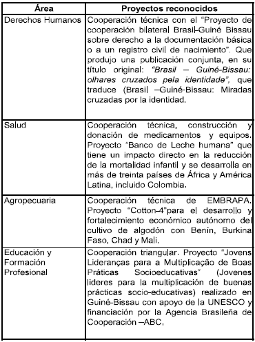 En el campo institucional de la política exterior brasileña se estableció la cooperación Sur-Sur (CSS) como aquella que promueve relaciones horizontales entre Brasil y países de África y América Latina principalmente. La CTPD pasó así a ser la principal herramienta para la realización de los proyectos de la mayoría de instituciones del gobierno como por ejemplo: la Empresa Brasileira de Pesquisa Agropecuária (EMBRAPA), la fundación Oswaldo Cruz (FIOCRUZ) y el Servicio Nacional de Aprendizagem Industrial (SENAI). Además de otras actividades como la cooperación científica y tecnológica, cooperación educacional, asistencia humanitaria, asistencia a refugiados, manutención de fuerzas de paz y trabajo conjunto con organismos internacionales, algunos de los proyectos se destacan en el Cuadro No. 2.