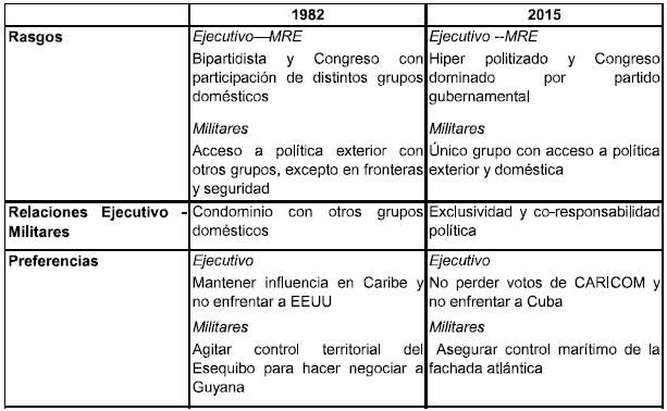 La comparación entre 1982 y 2015, según las preguntas planteadas, muestra que en el primer año los militares apoyaron la reclamación sin distinguir entre área terrestre y marítima, aunque conocían la importancia de la segunda porque en 1982 la Convención de la ONU sobre Derecho del Mar amplió plataformas marinas y submarinas y zonas de influencia económica. En 2015, la posición militar parece reducirse a la demanda marítima, de ahí el mayor rol de la Armada. En cuanto a participación y reacción del Ejecutivo a la posición militar, en el primer año Ejecutivo y militares coincidieron en proteger la integridad territorial y forzar a Guyana a negociar. En el segundo, la participación militar en política era mayor pero el Ejecutivo la moderó por su necesidad de respaldo político regional. El Cuadro 1 resume rasgos de actores, relaciones mutuas y preferencias en ambos períodos.