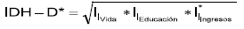 Luego, se calcula el IDH sobre la base del índice de ingresos sin transformación logarítmica (IDH*). Entonces, el valor que tendría el IDH-D* si todos los logros se distribuyeran de manera equitativa, se expresa: