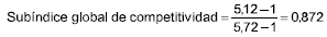 Tomando los datos aportados por el Fórum Mundial de Competitividad (2013), se aplica la formula (1) para calcular el subíndice de competitividad. Si, por ejemplo, para Australia el valor del IGC es igual a 5,12 (de acuerdo con la puntuación utilizada entre 1 y 7), y el máximo del IGC es de 5,72 puntos para Suiza (en un total de 141 países), y el mínimo es de un punto (mínima puntuación factible de conseguir para el IGC), se tiene: