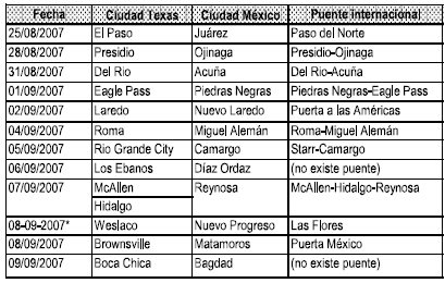 Por orden cronológico se describe primero Hands across el Rio y después la Ceremonia del Abrazo. La primera consistió en una serie de manifestaciones celebradas sucesivamente en un periodo de 16 días en 2007 en distintos pares de ciudades gemelas, desde El Paso y Ciudad Juárez hasta la desembocadura del río Grande/Bravo (Tabla 1). Se perseguía un doble objetivo: primero, mostrar el rechazo de las comunidades locales a la construcción del muro y, segundo, llamar la atención a nivel de Estados Unidos sobre la controversia del mismo (Border Ambassadors, 2007). Su organización estuvo a cargo de una coalición ad hoc, Border Ambassadors, liderada por el histórico activista anti-militarista Jay J. Johnson-Castro (Thompson, 2015), integrada por activistas y otras organizaciones contrarias al muro (“No Border Walls” y “Unidos Contra El Muro”) así como latinas, católicas, ambientalistas, pro-derechos de los migrantes, etc. de Estados Unidos (LULAC, Labor Council for Latin American Advancement, United League for Human Rights, Coalition of Amigos in Solidarity&Action, etc.).