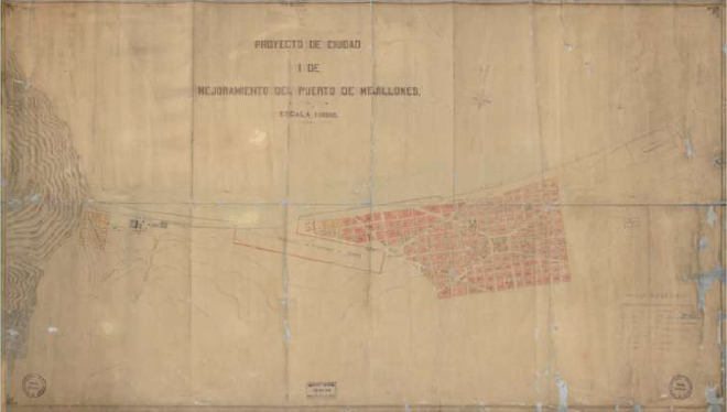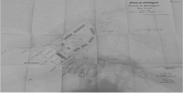 Por otra parte, el año 1908 el Gobierno de Chile, a través del Ministerio de Industria y Obras Públicas, envía al ingeniero Adam Scott (1909) y su equipo a constatar el estado de los puertos de Mejillones, Antofagasta, Iquique y Arica – en ese orden de importancia – y levantar planos con futuros proyectos para el mejoramiento de los mismos. Esto debido a que, si bien en 1906 se había comisionado a Emilio de Vidts para llevar a cabo la planificación de un nuevo puerto y ciudad que, en términos generales, tenía como prioridad por un lado ser una válvula de escape al problema del Puerto de Antofagasta, y por otro, construir una ciudad totalmente nueva, capaz de contener las manifestaciones sociales y permitir la fácil movilización de los policías, esto a raíz de lo ocurrido ese mismo años con las huelgas, dichos trabajos jamás se realizaron.