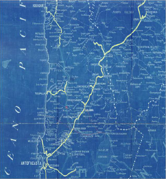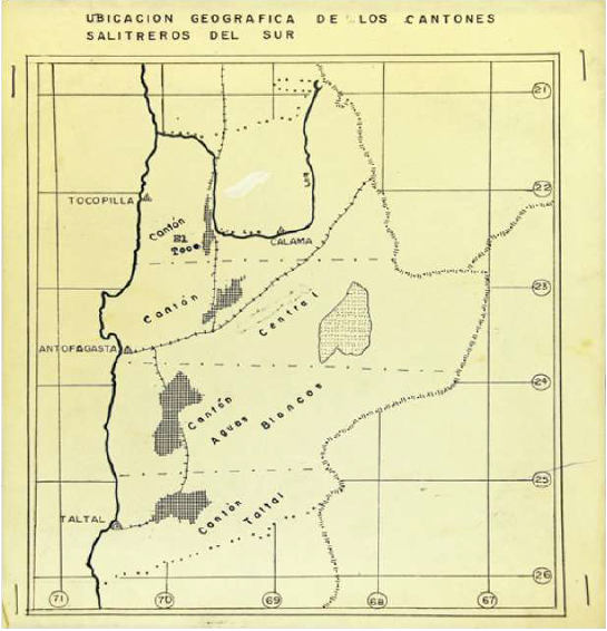 ARCHIVO HISTÓRICO NACIONAL. (1900-1908). Ubicación geográfica de los cantones salitreros del Sur, Archivo Histórico Nacional, Cartografía del Salitre