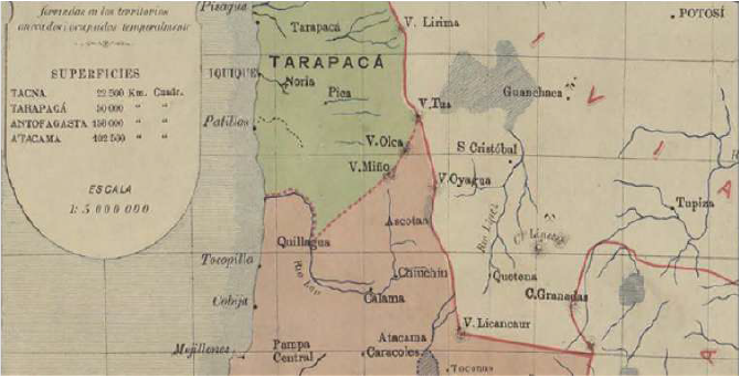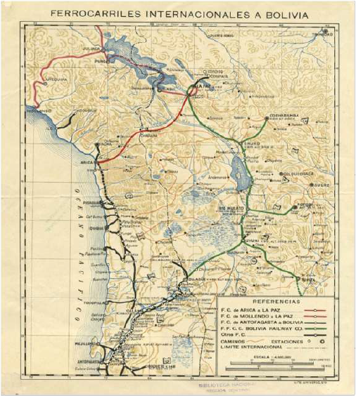 Según lo señalado por Loreto Correa Vera(2013), este afán de integrar a Bolivia al mercado mundial a través de la salida a su situación de mediterraneidad, se debe principalmente a la actitud tomada por los sucesivos gobiernos liberales tras la aceptación de los tratados de 1884 y 1904, en que el país altiplánico cede frente a los hechos y a cambio negocia compensaciones monetarias y de facilidades en la construcción de ferrocarriles y puertos; cuestión que se convierte en política de Estado para favorecer tanto a los productores mineros del Sur- Oeste del País como a los productores de goma del Nor- Oriente. Como se puede apreciar en las imágenes 3 y 5, el ferrocarril salitrero extendido hasta Bolivia conectó un extenso territorio entre el litoral y el altiplano, con lo que se integró a espacios regionales transfronterizos que habían sido separados por la guerra y los tratados de límites posteriores.
