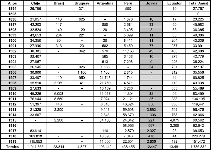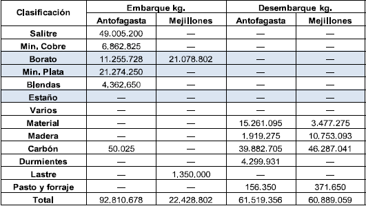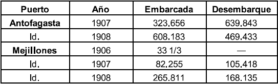 Al apreciar las cifras, es notorio el crecimiento exponencial que tienen tanto el embarque como el desembarque de productos en el recién habilitado puerto de Mejillones entre 1906 y 1908; lo que revela el nivel de producción del polo de desarrollo salitrero en Chile y del enclave de plata y otros minerales en el altiplano y Cordillera de Los Andes en Bolivia. Igualmente, las cifras revelan una incipiente necesidad de dar salida rápida a esa producción y de dar entrada para maquinarias, insumos industriales, equipos técnicos, bienes de consumo y circulación de mano de obra y comerciantes en ese territorio transfronterizo compuesto por la costa del Pacífico, la pampa salitrera, el Desierto de Atacama y la zona cordillerana del oeste boliviano.