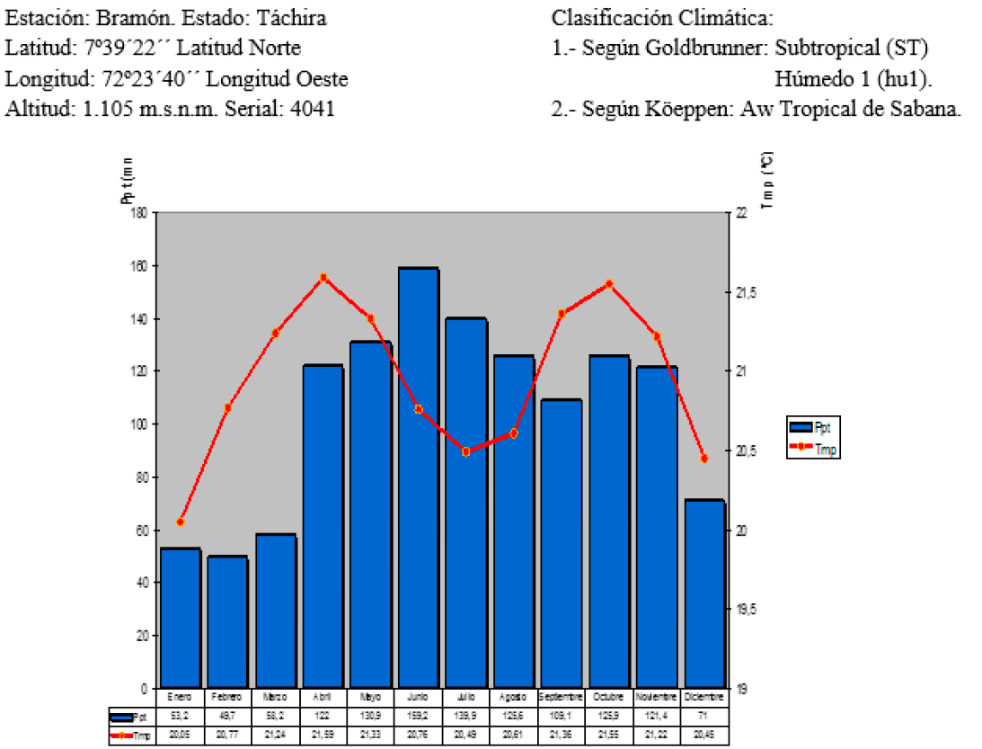 En todo caso, para el área de estudio seleccionada es oportuno destacar que la serie de años disponible en el INIA - Bramón constituye una de las más antiguas en Venezuela, sobre todo para datos como Precipitación (Ppt) y Temperatura (Tmp); las cifras datan desde el año 1936 hasta el presente. Siendo así, en la Composición 2 se presentan par de gráficos y en el Gráfico 1 el climodiagrama, respectivamente, preparados con series distintas de la misma estación Bramón y en los Gráficos 2, 3, 4 y 5 se incluyen los datos sólo de precipitación para cuatro estaciones de Rubio y sus alrededores (todas inoperativas).