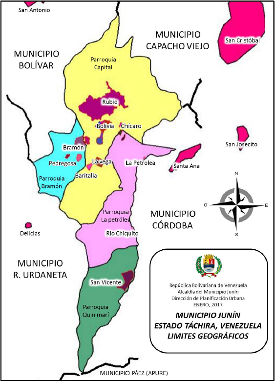 Ahora bien, Rubio, conocida como la Ciudad Pontálida, es la capital del municipio Junín del estado fronterizo de Táchira, al suroeste de Venezuela. El municipio está conformado por cuatro parroquias (Capital Junín, Bramón, La Petrolea y Quinimarí) (Composición 1) y según el INE (2011) se encuentra ubicado en la zona Sur-Occidental del estado Táchira; limita al Norte con el municipio Libertad (Capacho Viejo), al Sur con estado Apure, al Este con el municipio Córdoba, al Oeste con el municipio Bolívar y el municipio Rafael Urdaneta.