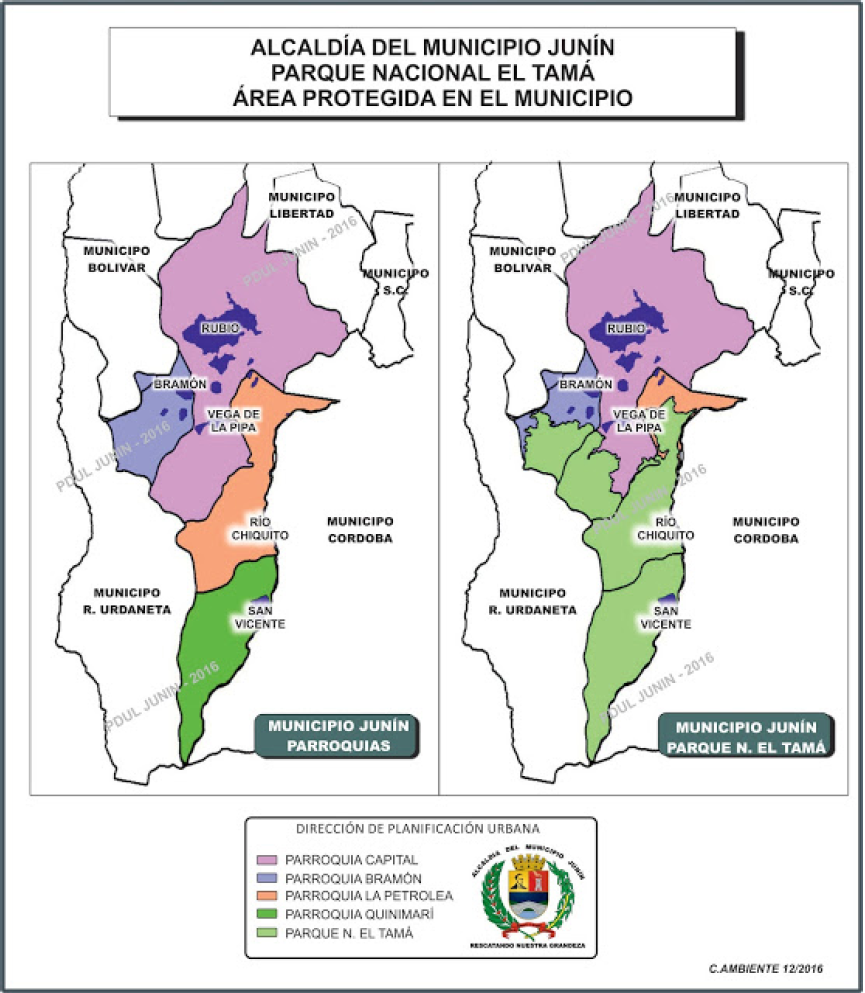 Asimismo, es importante reseñar que dentro del área de influencia del municipio Junín se ubican Áreas Bajo Régimen de Administración Especial (ABRAE), figuras jurídicas establecidas con el propósito de preservar y resguardar tanto el recurso hídrico como ecosistemas. Dichas áreas involucran los sectores altos, medios y bajos de las precitadas cuencas transfronterizas; según el INE (2011), las ABRAE que se pueden identificar en la región estudiada son: a) Parque Nacional El Tamá; b) Monumento Natural Abra de Río Frío; c) Zona Protectora de la ciudad de Rubio. Considerando datos de la Alcaldía de Junín (2016: s/n), en el Parque Nacional El Tamá, del total de la superficie amparada bajo la figura de resguardo