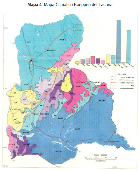 Si en cambio se considera la propuesta de Clasificación Climática de Köeppen, representada en el mapa preparado por el MARNR (1986), y además, si se retoma la ubicación de Rubio dentro de la Depresión del Táchira, en una especie de anfiteatro orográfico, al final se tiene que para el espacio geográfico sobre el cual se extiende la ciudad, así como para el resto del municipio Junín, es posible identificar al menos cuatro tipos de clima en el paisaje natural, distribuidos por sectores bien diferenciados (Mapa 4). Evidentemente, la proposición de clima que el MARNR fórmula para el área en donde se encuentra Bramón, Las Dantas y Rubio: Aw Tropical Lluvioso de Sabana, constituye una consideración que se ajusta y correlaciona muy bien con el análisis efectuado a partir de la Composición 2 y los gráficos 2 al 5.
