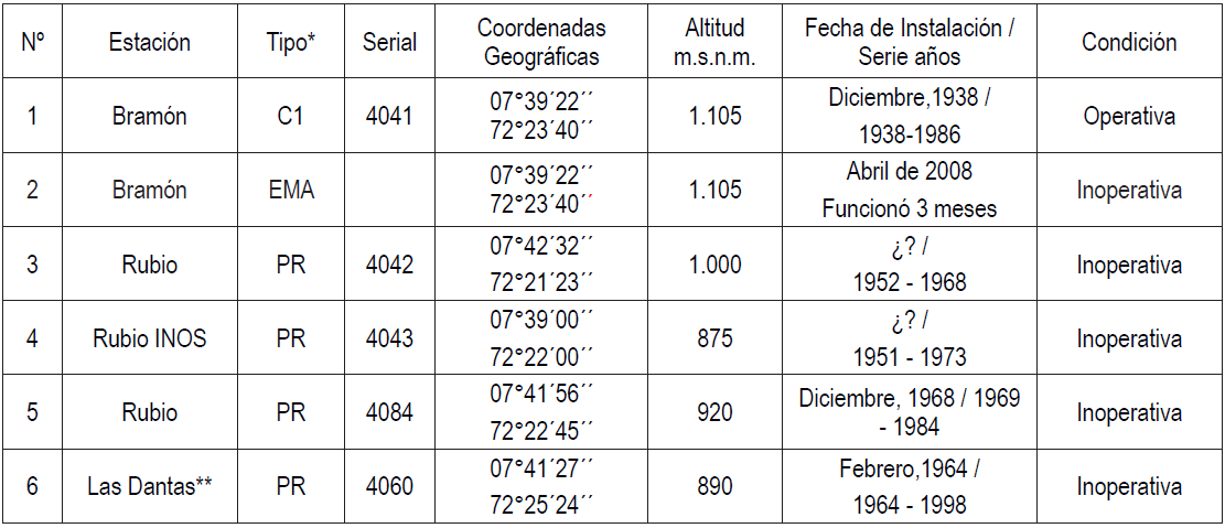 Los datos meteorológicos originales constituyen la base fundamental para la taxonomía y regionalización del clima. Lamentablemente, en el caso de Venezuela, no disponemos de una red de estaciones debidamente distribuida en el país… Esta situación es aún más crítica para las regiones montañosas…” (subrayado nuestro) Comenta Ricardo Ostos en entrevista personal de abril de 2009 (citado en Guerra et al., 2009), que en el estado Táchira, “la red de estaciones pluviométricas