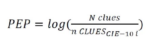 Donde la variable N CLUES consigna el número total de centros hospitalarios en el país con al menos un registro de nacimiento con anomalías, en este caso 2217. La variable n CLUES indica el número de centros hospitalarios que presentaron el i-esimo padecimiento ( CIE10 i) dentro del rango estipulado. La variable PEP permite contar con un ponderador para cada padecimiento, este ponderador tendrá un valor mayor a medida que el padecimiento ocurre en un subconjunto menor de CLUES dentro de la muestra estudiada, lo que indica que se trata de un padecimiento no común, pero específico del área.