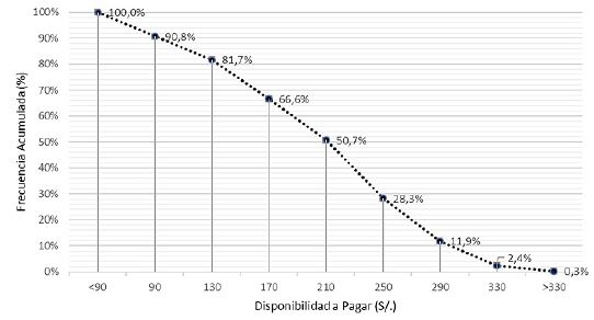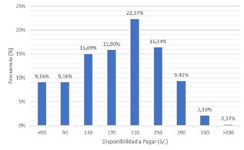 A pesar de ello, la distribución poblacional de la muestra en términos de DAP es muy similar al el resto de las investigaciones. Así como se ve en la figura 3, otros estudios muestran una distribución similar: mayor frecuencia en montos centrales (ejemplo: S/. 170 o S/. 210) y menor frecuencia en montos extremos. Es importante que se vea esta distribución de frecuencias, ya que muestra el comportamiento esperado de un individuo en el mercado ( 13). Según lo establece la teoría económica, a mayor precio menor la demanda esperada ( 15). En la figura 2 se puede apreciar que existe una distribución con ligero sesgo a la derecha (o sesgo positivo), y no una distribución simétrica, lo cual representa la decisión del consumidor de pagar lo menos posible por un bien o servicio. La misma distribución se ve en los estudios de Godoi et al. ( 11) y de Palanca-Tan ( 12).