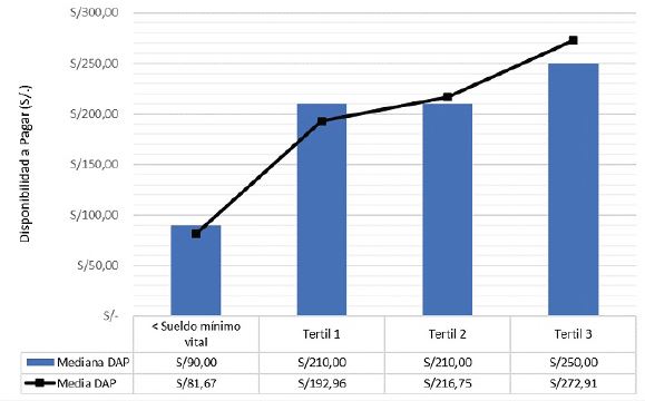 En términos de la DAP, el monto con mayor frecuencia de elección fue el de S/. 210 (22,37%). El resto de DAP discretas tuvo frecuencias menores. Solo 1 participante refirió que pagaría más de las cantidades discretas incluidas en la encuesta. La distribución de frecuencias según la DAP se puede observar en el las figuras 2 y 3. La mediana también corresponde al valor de S/. 210. Se hizo una distribución de los valores de DAP según tertiles de ingreso económico personal mensual en la figura 4, tanto para la mediana como para la media. Solo 6 sujetos percibían un ingreso económico menor del sueldo mínimo vital ( 30).