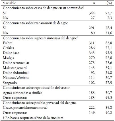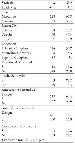 De los cuestionarios válidos, la edad promedio de los sujetos era 42,1 ± 11,7 años, 66,8% era de sexo masculino, 47,4% eran casados, y solo el 24% tenía educación superior completa. 23 sujetos eran profesionales de la salud. 239 personas refirieron un antecedente personal de dengue, y 271 refirieron un antecedente familiar de dengue. El resto de las características poblacionales se pueden ver en las tablas 1 y 2.