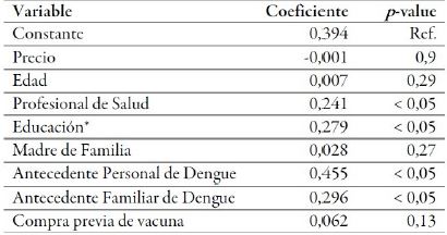 En el modelo Logit de regresión logística, se incluyeron las siguientes variables: edad, nivel de educación, si el sujeto es profesional de la salud, si es madre de familia, si tiene antecedente personal de dengue, si tiene antecedente familiar de dengue y si ha comprado vacunas anteriormente. La variable de precio tuvo un coeficiente de -0,009. Las variables que resultaron estadísticamente significativas para la compra de la vacuna contra dengue fueron ser profesional de la salud, nivel de educación, antecedente personal y familiar de dengue. Los coeficientes y valores p están descritos en la tabla 3.