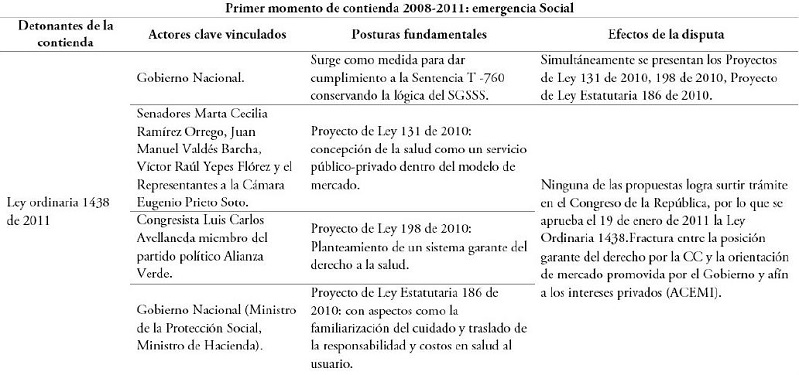 El primer momento de la contienda inició en 2008 con la declaratoria, por parte de la CC, de la salud como derecho fundamental autónomo mediante la sentencia T-760 de 2008. A partir de ello se activó la disputa entre los diferentes actores del sistema de salud, la cual se extendió hasta 2011, cuando fue promulgada la Ley 1438. Sin embargo, esto no significó el fin de la disputa.