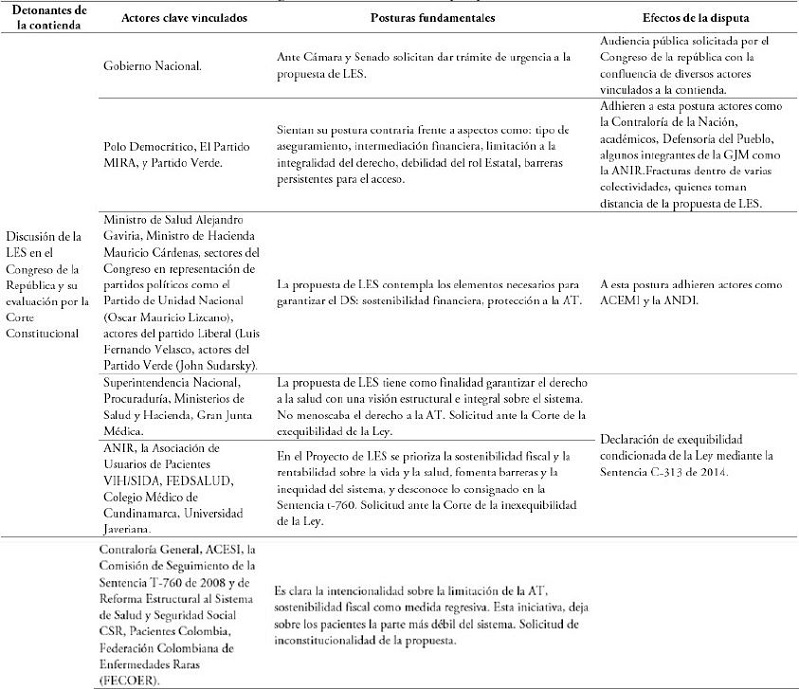 Desde el Estado, en defensa de la salud como derecho humano fundamental, se cuentan los siguientes actores: la CC, la Defensoría del Pueblo, algunos miembros del Congreso de la República, en particular senadores del Polo Democrático Alternativo, la Unión Patriótica, el Partido de la U, el Partido Conservador y el Partido Liberal; el Ministerio de Salud, y la Súper Intendencia Nacional de Salud. En representación de la sociedad civil, a favor de los intereses del mercado y de las Empresas Promotoras de Salud (EPS) se identifica la Asociación Colombiana de Empresas de Medicina Integral (ACEMI). Ahora bien, representando la visión de salud como derecho fundamental se cuentan los siguientes actores: el Movimiento por la Salud (MS), la Facultad Nacional de Salud Pública Universidad de Antioquia (FNSP), el Movimiento Nacional por la Salud y la Seguridad Social (MNSSS), la Central Unitaria de Trabajadores de Colombia (CUT), la Coalición de Movimientos y Organizaciones Sociales de Colombia (COMOSOC) y la Asociación Nacional de Trabajadores de Hospitales y Clínicas (ANTHOC). A todos estos actores se suman los diferentes grupos de seguimiento a la sentencia T-760 de 2008.