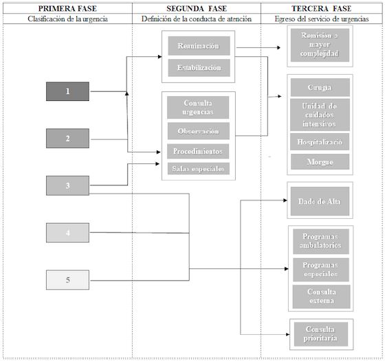 En específico, la continuidad del proceso de atención en el servicio de urgencias puede dividirse en tres fases: clasificación de la urgencia, definición de la conducta de atención y egreso del servicio, cuya dinámica de flujo se puede observar en la Figura 1.
