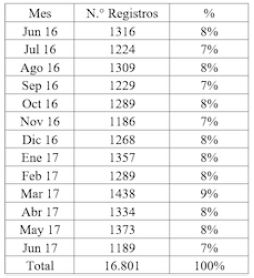 Se analizaron un total de 16.801 registros de usuarios atendidos. En cuanto a los meses de consulta, no se encontraron diferencias significativas en el número de pacientes atendidos, aunque se destaca el mes de marzo que, con 1438 registros (9%), presentó la mayor cantidad de consultas, el resultado de los demás meses se puede observar en la Tabla 2.