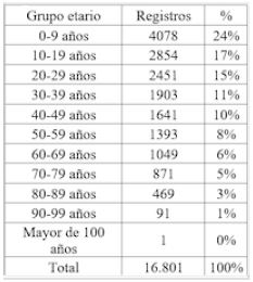 En cuanto a la caracterización demográfica de la población, 9037 atenciones (54%) correspondieron a personas de sexo masculino. Respecto al grupo etario, los que más asistieron fueron los menores entre 0-9 años con 4078 atenciones (24%); seguido por el grupo entre los 10-19 años con 2854 consultas (17%); las personas entre 20-29 años asistieron al servicio en 2451 ocasiones (15%); para adultos entre 30-39 años se evidenciaron un total de 1903 consultas (11%); las personas entre 40-49 años presentaron un número de atenciones de 1641 (10%); los adultos de 50-59 años, 1393 (8%) El comportamiento del resto de grupos etarios se puede observar en la Tabla 3.