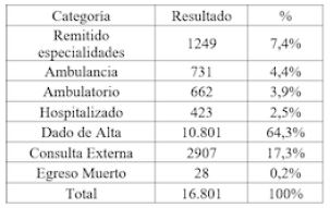 Como se observa en la Tabla 4, respecto al egreso del servicio, se evidenció que la mayor cantidad de pacientes, 10.801 (64,3%), fueron dados de alta; mientras que 2907 (17,3%) fueron remitidos a consulta externa, 1249 pacientes (7,4%) fueron remitidos a las especialidades, dentro de las que se destacan medicina interna, obstetricia y ginecología, pediatría, cirugía general, ortopedia y traumatología, medicina general y psiquiatría. 423 pacientes (2,5%) fueron enviados a hospitalización, y tan solo 28 pacientes (0,2%) fallecieron. Por triaje de ingreso, los fallecidos se clasificaron así: triaje II, 15; triaje I, 8 casos y, en último lugar, el triaje III, con 5.
