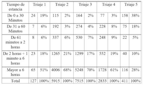 Lo anterior denota posibles fallas en la calidad de la atención recibida por los usuarios, lo que pone en riesgo su bienestar e incluso su vida. En estudios realizados se reconoce que largos periodos de estancia en el servicio conducen a resultados adversos, como mayor tiempo de hospitalización y un aumento de la mortalidad ( 6, 14, 15). En otros estudios se evidenció una asociación entre las interrupciones en el proceso de realización del triaje y errores y tardanzas en el tratamiento de los pacientes, así como mal uso de los recursos del servicio ( 16, 17).