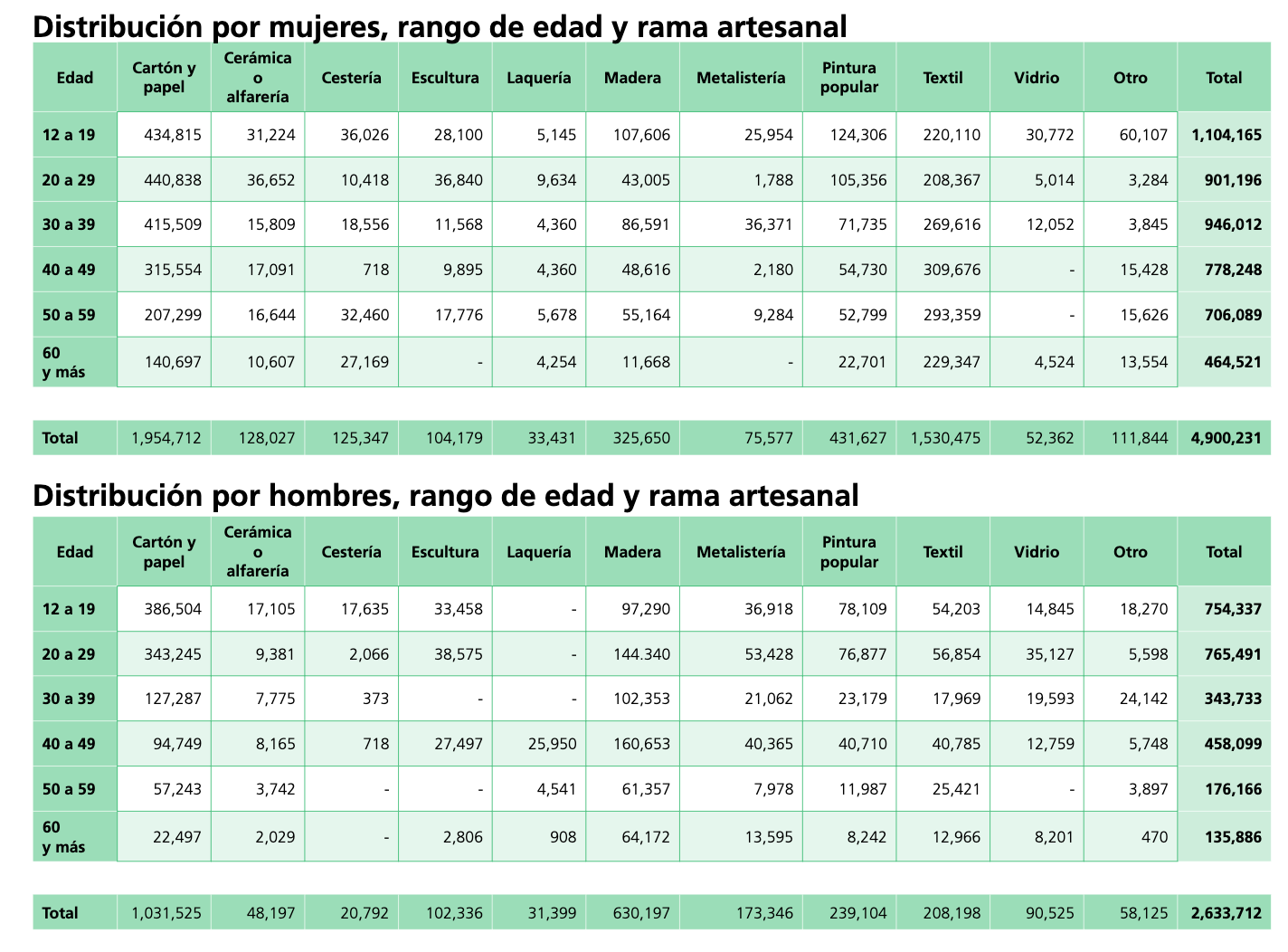 De acuerdo con INEGI-FONART “resulta que 7’533,943 personas de 12 y más años produjeron artesanías en localidades de 15 mil y más habitantes a nivel nacional en el año 2012” (FONART, SEDESOL, INEGI., 2018, p. 8) (Tabla 1)