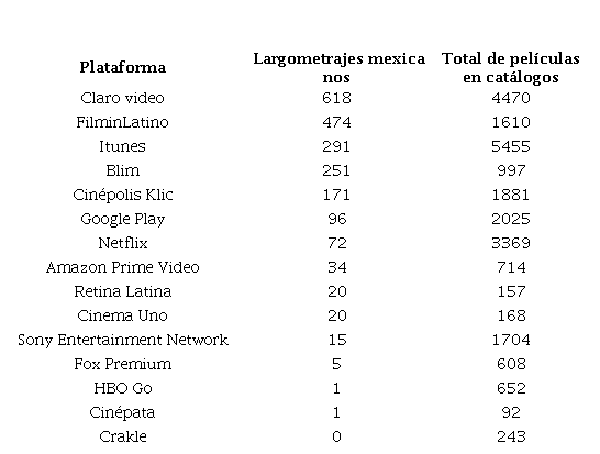 “Mubi no se consideró en el conteo porque tiene catálogo itinerante: diario se estrena una película, disponible para su visualización por 30 días.” (IMCINE, 2018) En 2016, Claro Video también era la plataforma digital con más títulos mexica-nos, siendo el 16% de su catálogo títulos mexicanos. (Tabla 10.)