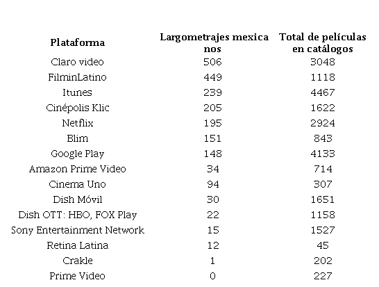 De todas las plataformas, Claro Video es la ventana digital que más películas mexicanas ofrece dentro de su catálogo, en porcentaje el 13% de sus películas son mexicanas, mientras que la plataforma con mayor número de suscriptores Netflix, ofrece solamente el 2% de películas mexicanas. (Tabla 9.)