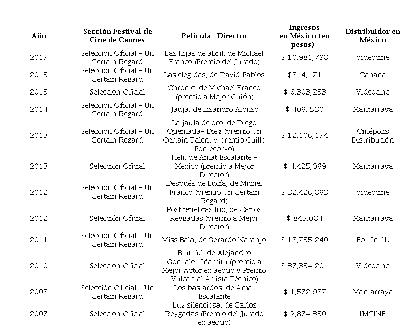 Solo para tener una referencia, películas mexicanas han tenido la oportunidad de participar en el Festival de cine de Cannes a lo largo de la historia y han logrado obtener distribución comercial en México, logrando diferentes resultados en taquilla. (Tabla 11.)