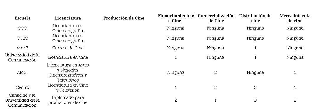 Le sigue CENTRO en donde el 90% se le dedica a la producción de cine y el 10% a la venta, con materias como “Financiamiento y Venta, Producción, Distribución y Exhibición de cine y Mercadotecnia y competitividad”, etc. (CENTRO, 2018) El resto de las escuelas, tienen presencia de las disciplinas, pero en una menor escala. (Tabla 12.)