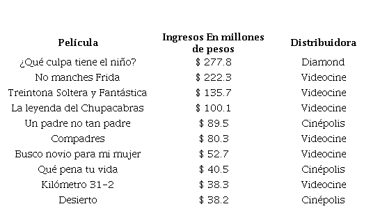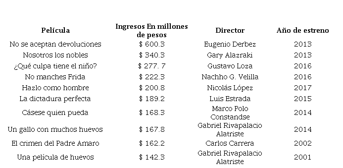 La película mexicana más taquillera en 2016 fue Qué culpa tiene el niño con ingresos en taquilla de $277,785,683 pesos, ganándose así el 3er lugar de las películas mexicanas más taquilleras en la historia. (CANACINE, 2016) La película mexicana más taquillera en la historia es No se aceptan devoluciones con más de 600 millones de pesos en taquilla, le sigue en segunda posición Nosotros los Nobles con ingresos de 340 millones de pesos. (Cervantes, 2013) (Tabla 5.)