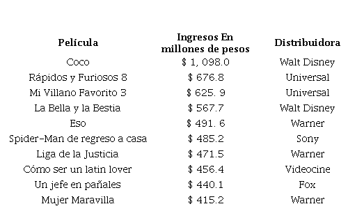 Dentro de las 10 películas más taquilleras en 2017 (Tabla 1.) no encontramos ninguna producción mexicana. La película Cómo ser un latin lover que, aunque maneja una temática latina y cuenta con actores mexicanos, es una producción americana producida por Pantelion Films (Internet Movie Data Base [IMDB], 2017), y el resto de los estrenos provienen de producciones de los grandes estudios cinematográficos extranjeros. (CANACINE, 2017)