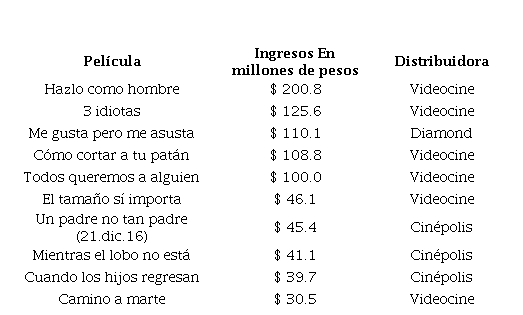 De cualquier forma, en 2016 el 64% de las películas mexicanas estrenadas, no alcanzan ni siquiera recaudar 1 millón de pesos, mientras que las 4 películas más taquilleras sobrepasan los 100 millones de pesos. (Tabla 6.)
