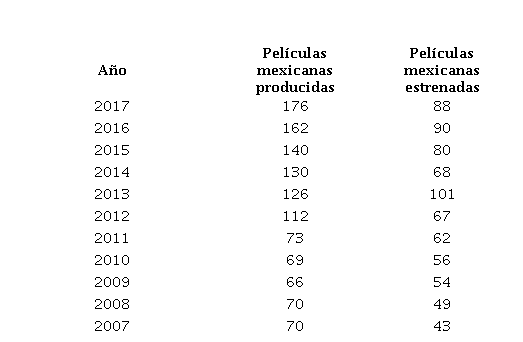 Según la Cámara Nacional de la Industria Cinematográfica (CANACINE, 2017), en el año 2017 México logró recaudar en taquilla 16,661 millones de pesos, 9.2% más que en 2016, y eso excluyendo al resto de las ventanas de distribución. El Instituto Mexicano de Cinematografía (IMCINE, 2018) reporta que en 2017 se estrenaron un total de 424 películas en salas cinematográficas, dentro de las cuales solamente 88 películas fueron películas mexicanas.