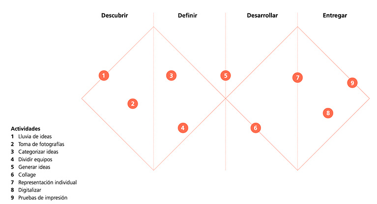 Al obtener dichos resultados, se pensó en un rediseño de la planeación para llevar a cabo el taller de diseño en la Fundación CEDAC. Se retomó la metodología base del Design Council, consejo del diseño de Reino Unido que es reconocido por ser una autoridad de diseño estratégico, que en 2015 se estructura en una guía para enseñar diseño en talleres dirigidos a alumnos de nivel de educación media (Design Council, 2015) adaptando las fases para facilitar el entendimiento de los participantes, así como variaciones para enfocar el tema y las actividades de acuerdo al entorno de la comunidad.