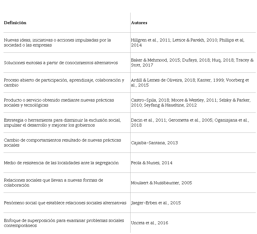 La IS ocurre cuando emprendedores sociales deciden implementar ideas creativas para generar un beneficio social (Martin et al., 2015), por medio de cambios en algún producto, servicio o modelo (Lettice & Parekh, 2010). Pero también cuando se alienta a las comunidades a ser innovadoras para resolver sus propios problemas y ser autosuficientes (Massey & Johnston, 2016), especialmente en las economías emergentes (Rao et al., 2017).