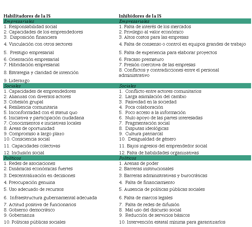 En esta categoría, los habilitadores refieren a los elementos que, de acuerdo con los autores, posibilitan e impulsan a la IS. Los inhibidores son elementos que impiden o dificultan que la IS se lleve a cabo. A continuación se mencionan los principales habilitadores e inhibidores identificados en la revisión que, dadas sus características, pueden agruparse en tres ámbitos: empresariales, sociales y políticos.
