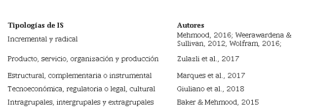 Tipologías. La tipología de IS más referida en los textos es la clasificación incremental o continua y la radical o disruptiva; mientras la primera hace referencia a un cambio social benéfico concretado de forma paulatina, la segunda consiste en la mejora significativa o la transformación total de un producto, servicio o mercado (Mehmood, 2016; Perrini et al., 2010; Selsky & Parker, 2010; Seyfang & Haxeltine, 2012; Weerawardena & Sullivan, 2012; Westley et al., 2014; Wolfram, 2016). El tipo incremental o continuo es el que los autores más relacionan con la IS, pues aseguran que ésta tiene una naturaleza más compleja que otros tipos de innovación, por lo que requiere de más tiempo para lograr llegar al objetivo (Biggs et al., 2010; Dacin et al., 2011; Gerometta et al., 2005; Kanter, 1999; Maruyama et al., 2007; Moore & Westley, 2011; Swyngedouw, 2005; Voorberg et al., 2015). Aunque también hay otros autores que rescatan el tipo radical o disruptivo que puede tener la IS, al darse innovaciones locales no previstas que surgen como producto de los cambios en los contextos internacionales (Dufays, 2018; Grimm et al., 2013; Martin et al., 2015; Le Ber & Branzei, 2010; Salim y Ellingstad, 2016).